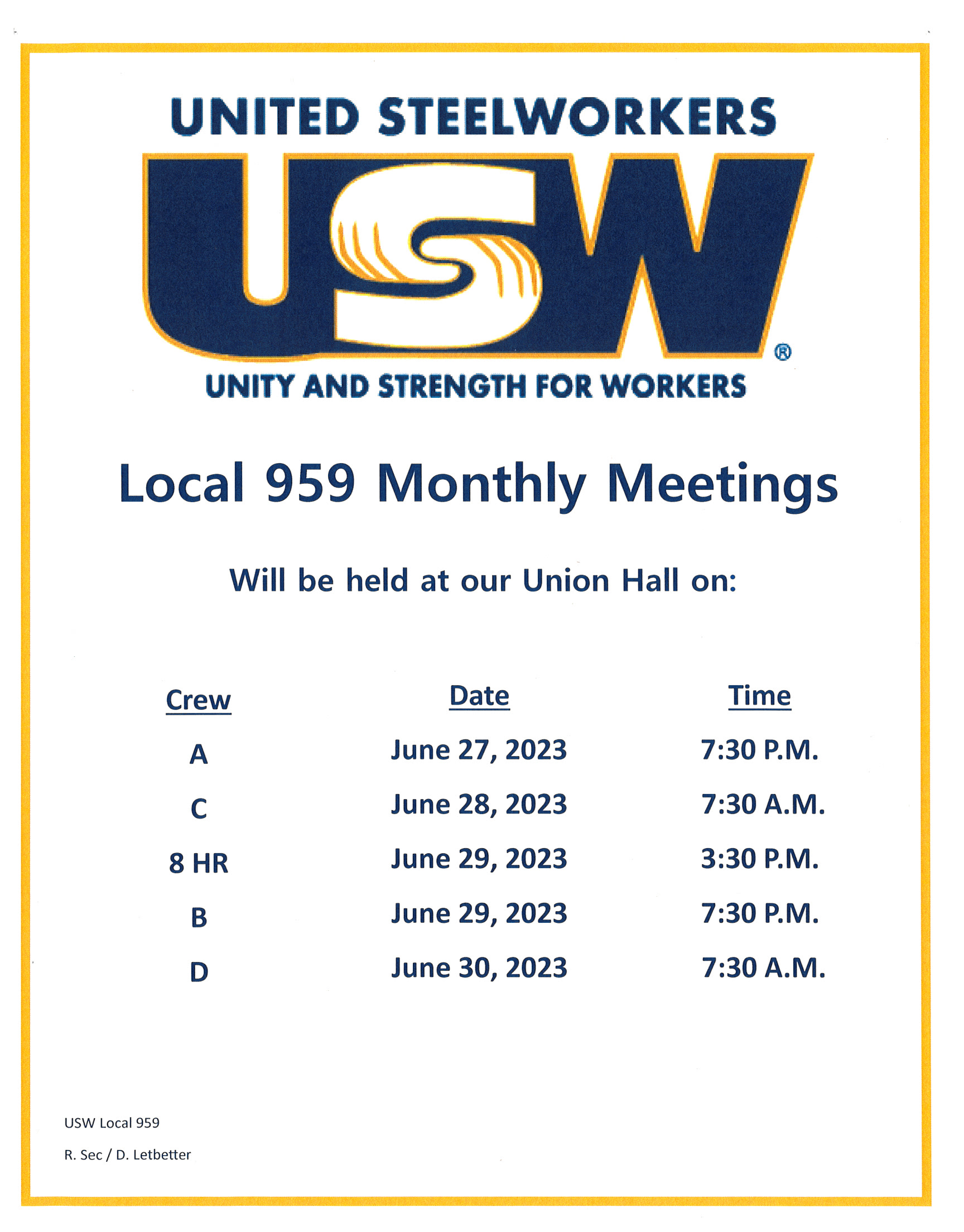 Membership Meetings for June Membership meetings for June will be held as follows: June 27, 2023 A Crew 7:30 pm June 28, 2023 C Crew 7:30 am June 29, 2023 8 HR 3:30 pm June 29, 2023 B Crew 7:30 pm June 30, 2023 D Crew 7:30 am Share this: Click to share on X (Opens in new window) X Click to share on Facebook (Opens in new window) Facebook Like Loading... Related