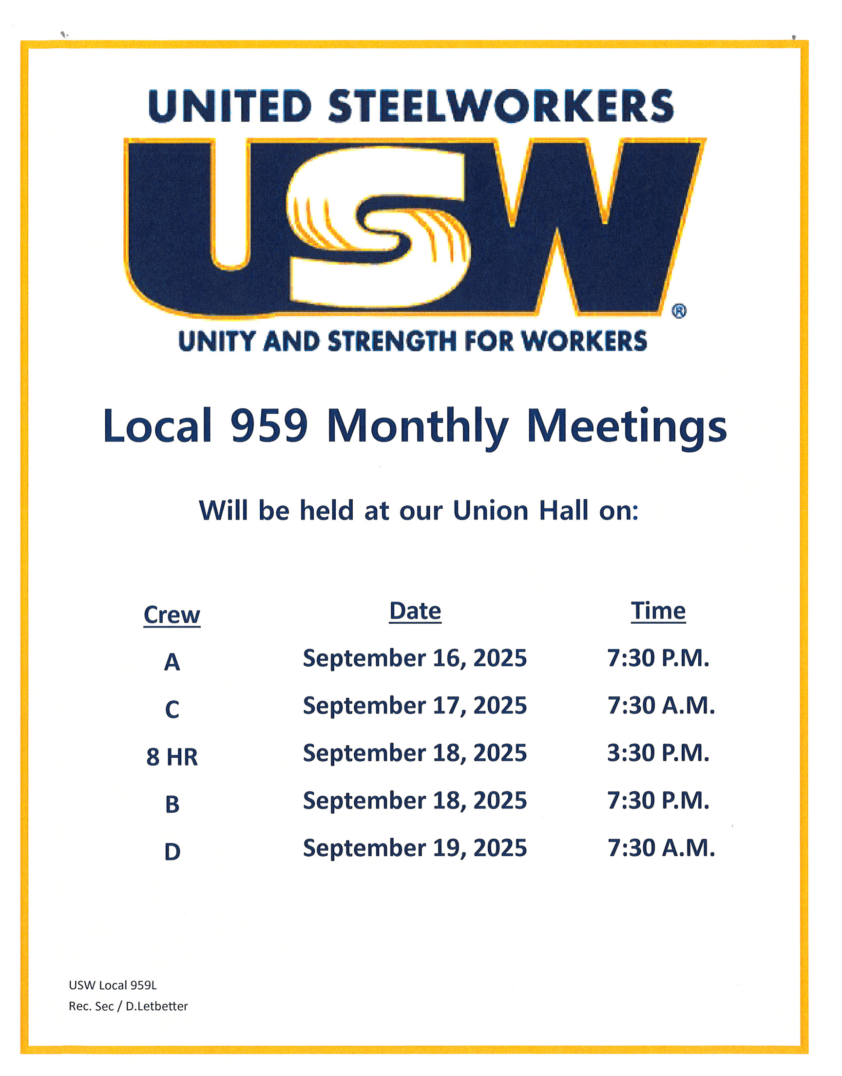 Membership Meetings for September Membership meetings for September will be held as follows: September 16, 2025 A Crew 7:30 pm September 17, 2025 C Crew 7:30 am September 18, 2025 8 HR 3:30 pm September 18, 2025 B Crew 7:30 pm September 19, 2025 D Crew 7:30 am Share this: Click to share on X (Opens in new window) X Click to share on Facebook (Opens in new window) Facebook Like Loading... Related