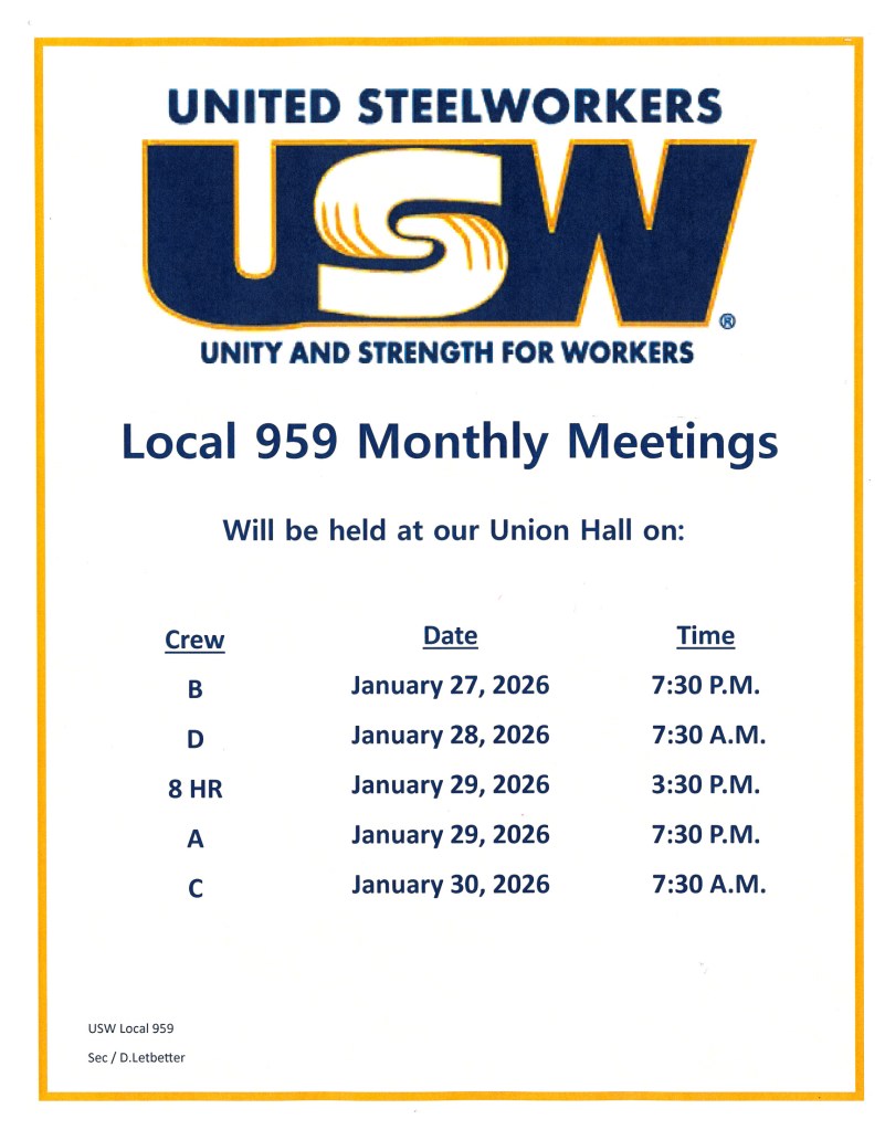 Membership Meetings for January Membership meetings for January will be held as follows: January 27, 2026 B Crew 7:30 pm January 28, 2026 D Crew 7:30 am January 29, 2026 8 HR 3:30 pm January 29, 2026 A Crew 7:30 pm January 30, 2026 C Crew 7:30 am