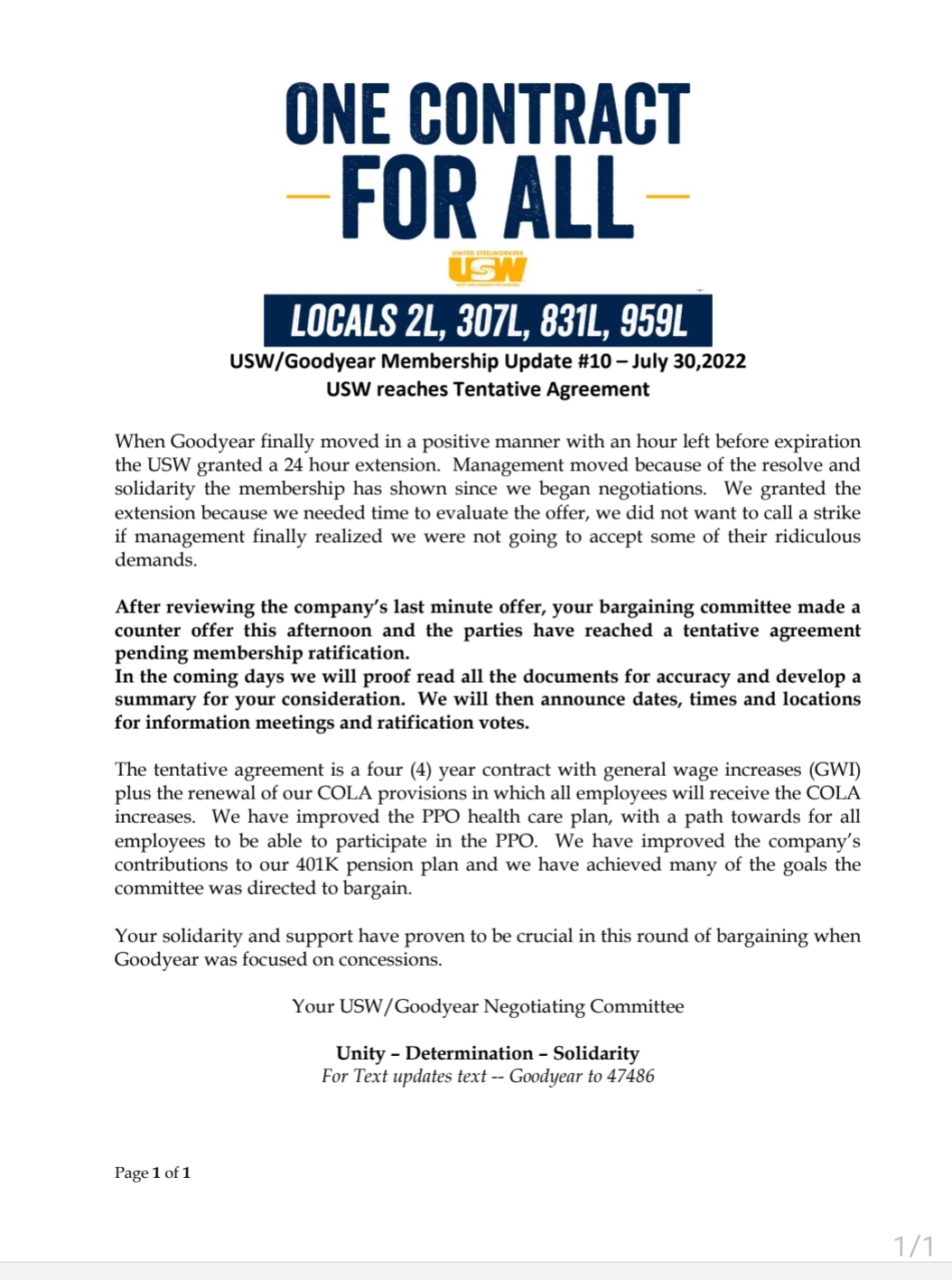 If a strike is called, we will be picketing ONLY at the designated picket area, from the entrance to the stop light. Do not cross over onto Goodyear’s property.