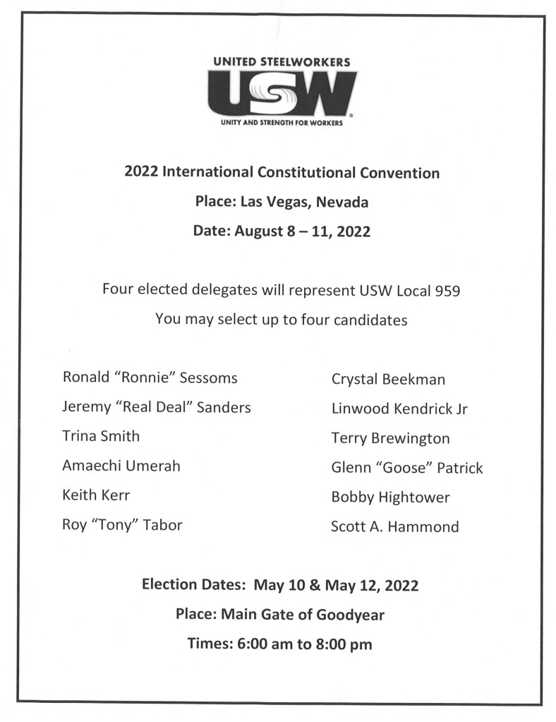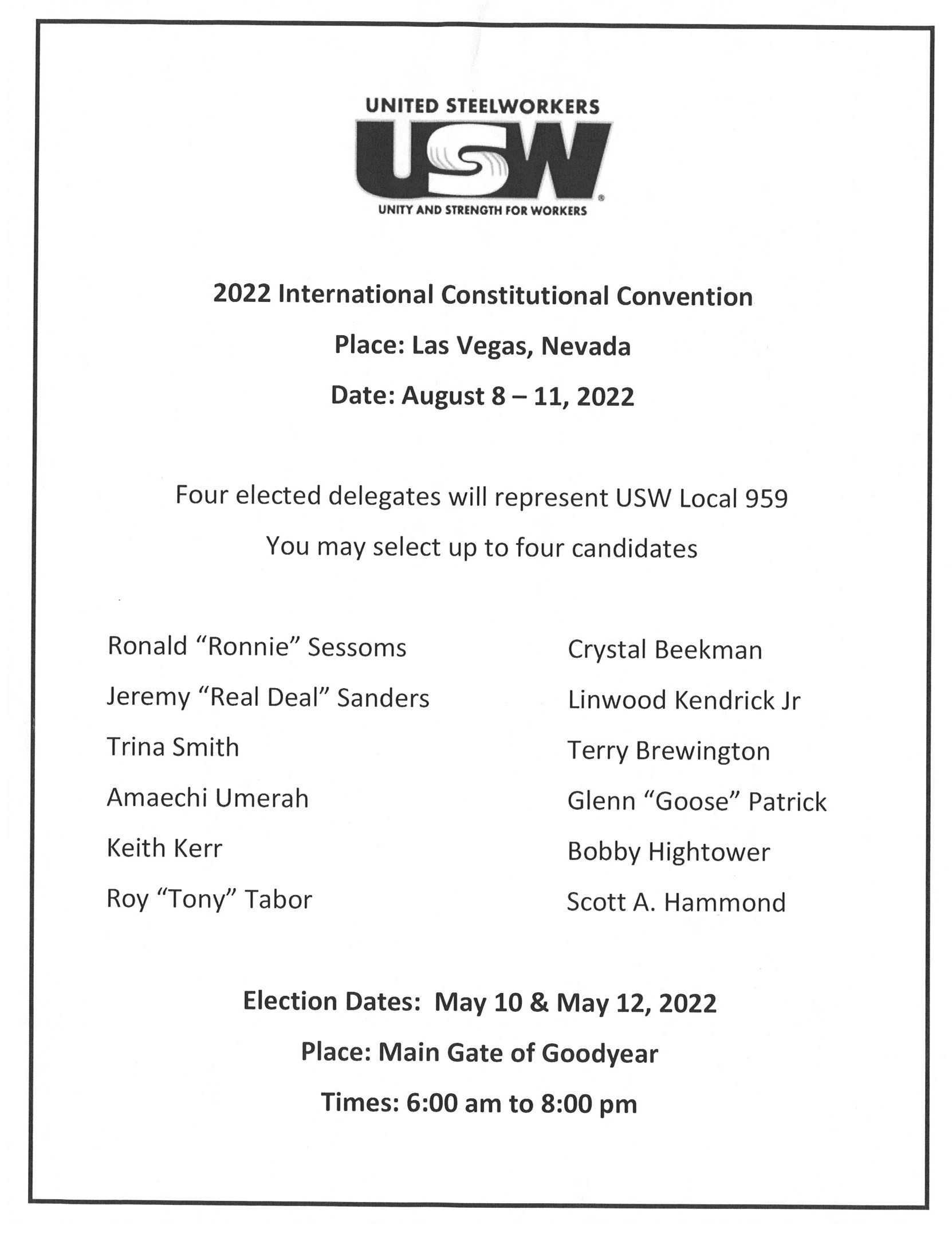 Constitutional Convention Delegate Vote The vote for delegates to the 2022 USW International Constitutional Convention will be held at the Main Gate from 6am to 8pm on Tuesday, May 10, 2022 and Thursday, May 12, 2022.